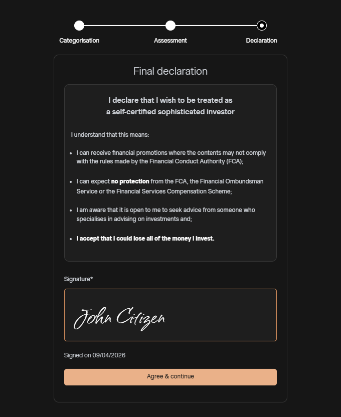 Sophisticated Investors - Before they can view a financial promotion on Odin, Sophisticated investors must self-certify that one of the following statements applies to them: